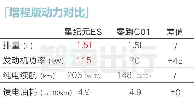 星纪元ES增程版提供33.67/39.91kWh两种磷酸铁锂电池,工况下纯电续航205km,馈电油耗4.9L/100km、5.7L/100km,账面参数优于零跑C01。